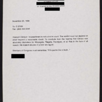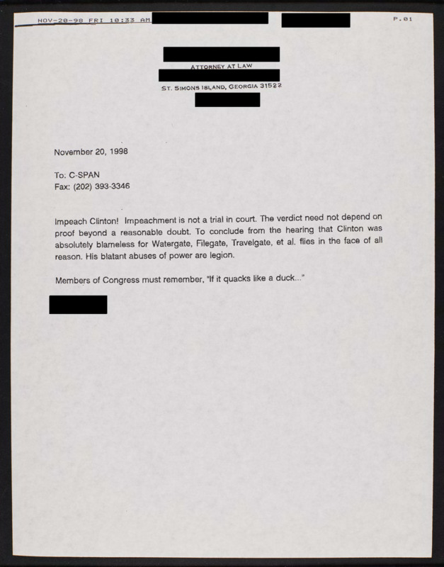 Urges the impeachment of Bill Clinton and accuses Clinton of abuse of power.