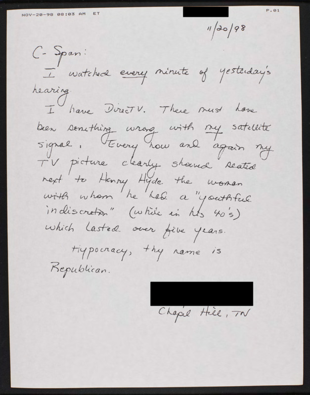Accuses Henry Hyde and Republicans of hypocrisy for not addressing their own indiscretions.