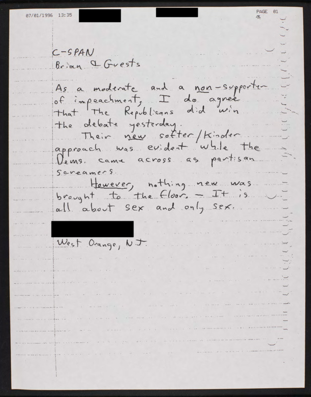 Believes that the Republicans won the debate at the impeachment hearings but that no new information was brought up.