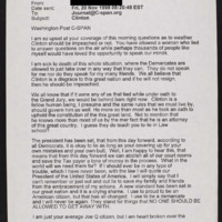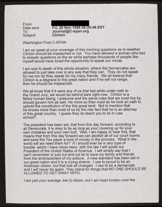 Accuses C-SPAN of bias and instead argues that Bill Clinton is guilty and should be punished, then describes dislike of the media's representation of Democrats as the only voice.