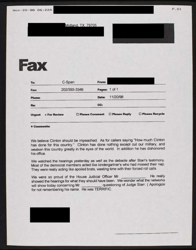 Criticizes Bill Clinton's treatment of the military and the behavior of the Democrats during the impeachment hearings and praises one officer.