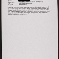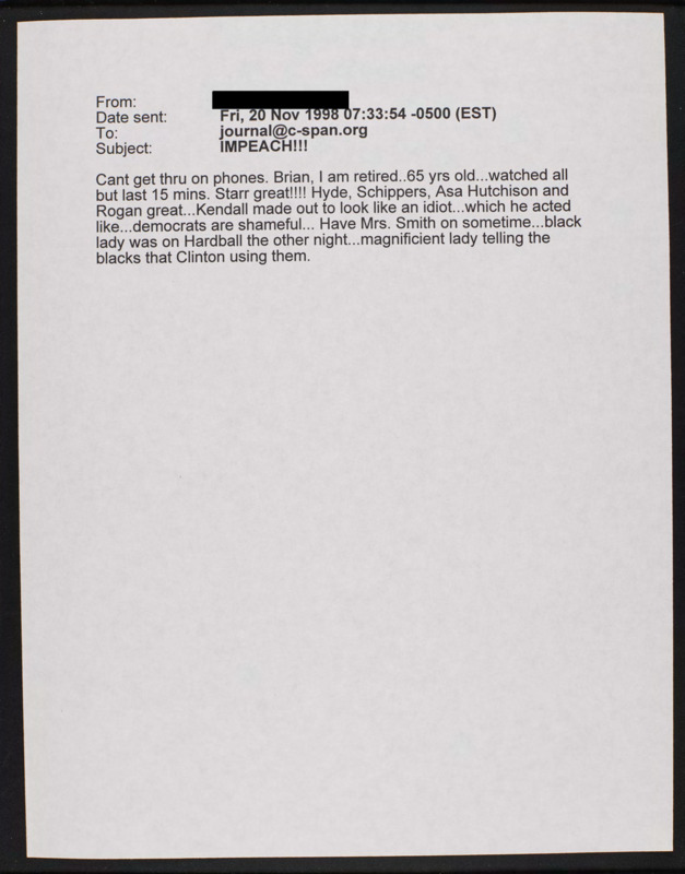 Praises several prominent Republicans at the impeachment hearings and expresses distaste of the Democrats, then recommends inviting one woman on C-SPAN to discuss Bill Clinton's alleged betrayal of African-Americans.