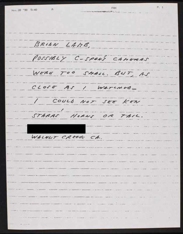 Facetiously states that they could not see Ken Starr's horns or tail on camera.