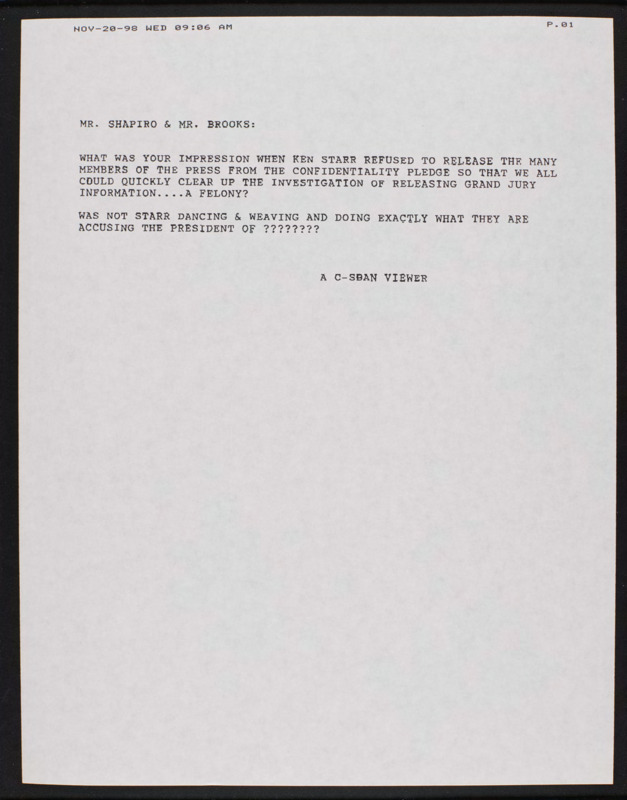 Accuses Ken Starr of hypocrisy for not allowing reporters to be released from confidentiality.