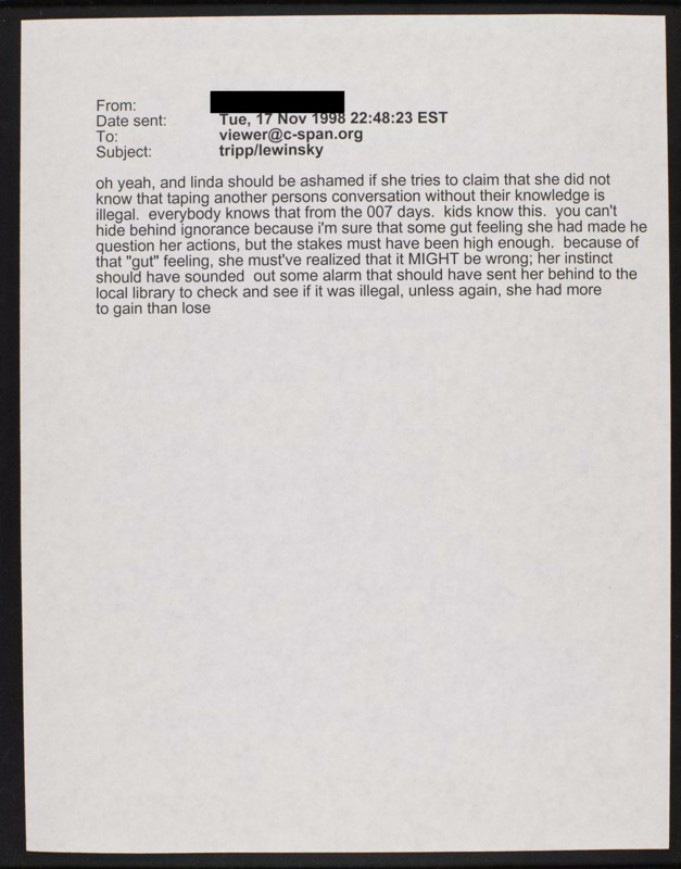 Disputes Linda Tripp's claim that she did not realize taping a conversation without their knowledge is illegal.