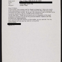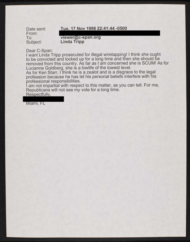 Wants Linda Trip prosecuted for illegal wire-tapping and calls Ken Starr a zealot.