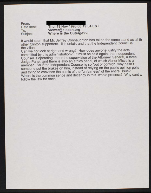 Accuses a C-SPAN guest of bias and argues for the independence of the Independent Counsel.