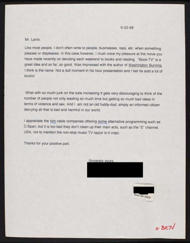 Thanks C-SPAN for Book TV and states enjoyment of it, then wishes cable companies took violence and sex off of television.