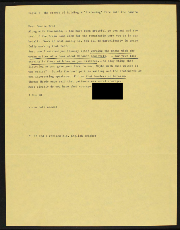 Praises Brian Lamb, particularly for maintaining polite composure during "boring" calls.