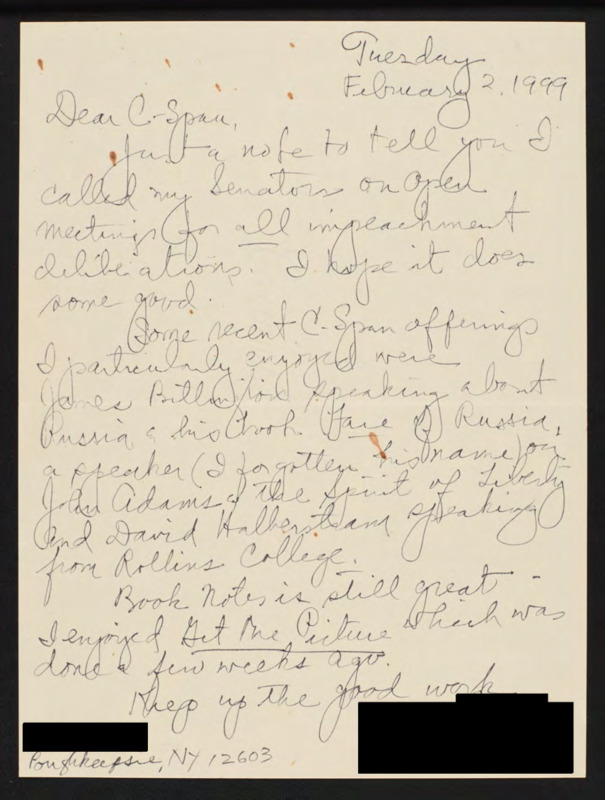 Reports that they called their senator about impeachment, then describes enjoyment on particular episodes of Book TV and Booknotes.