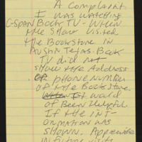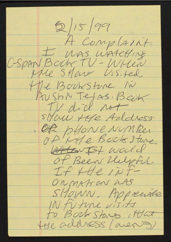 Complains that C-SPAN did not show the address or phone number of the bookstore they visited in Austin.