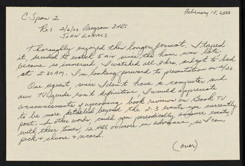 Expresses enjoyment of a Booknotes program and requests a program schedule, then praises C-SPAN.