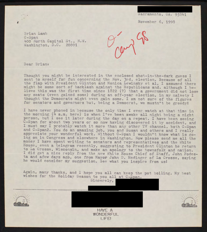 Encloses their predictions of the outcome of the election, then expresses enjoyment of C-SPAN.