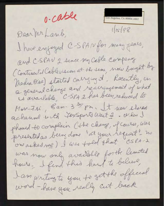 Reports that their cable company cut C-SPAN 2 broadcast hours and inquires if it is a new C-SPAN policy.