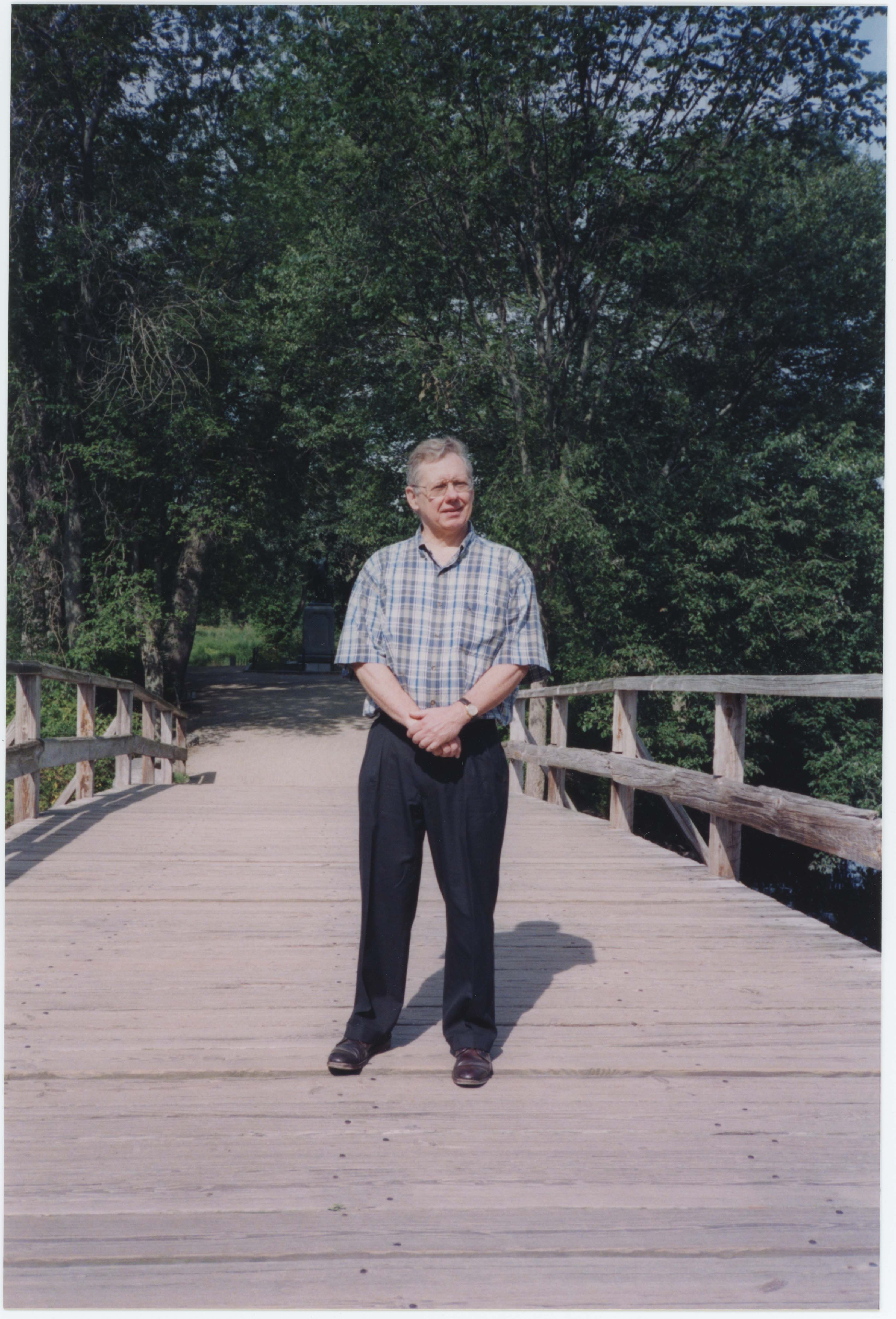 Gordon Wood posing for a photo on the North Bridge at the Minute Man National Historical Park.