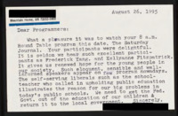 Letter to C-SPAN, 1995-08-26; 98225 Praises C-SPAN, states they miss the Journalists' Roundtable, and praises a particular guest. -