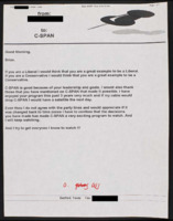 Letter to C-SPAN, 1997-04-18 Expresses pride in being a Democrat and frustration that C-SPAN allegedly lets Republicans call in on the Democratic line. -