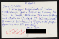 Letter to C-SPAN, 1995-04-11 Enjoys C-SPAN's simulcasts and suggests Jerry Brown's talkshows. -