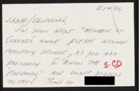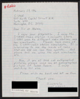 Letter to C-SPAN, 1996-02-29 Asks for C-SPAN to have more simulcasts of radio programs and asks for an autographed picture of Susan Swain. -