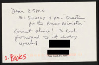Letter to C-SPAN, 1996-11-21 Asks for the name of a book on the history of C-SPAN and praises C-SPAN. -