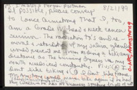 Letter to C-SPAN, 1999-08-21 States that they had the same kind of cancer as Lance Armstrong, describes the limitations put on him by that, and asks that Armstrong not speak for everyone with that kind of cancer. -