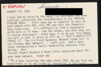 Letter to C-SPAN, 1996-01-22 Complains about the political ads run by both parties and compares it to Nazi propaganda, then asks for the Moscow News back. -