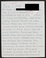 Letter to C-SPAN, n.d.; 37938 Expresses feeling that people are overly litigious and mentions things about their personal past. -