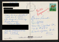 Letter to C-SPAN, 1995; 29661 Praises the network and asks for the network to distribute bumper stickers. -