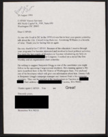 Letter to C-SPAN, 1994-08-30; 98310 Says they loved living in Washington D.C. during the 70s. Praises the network for being educational and sparking their interest in local politics. Suggests following candidate Benjamin Gregg in the Congressional elections. -