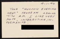 Letter to C-SPAN, 1994-11-01; 93534 Explains why they enjoy the Moscow Evening News. Shares how they would watch the program while travelling in Russia. -