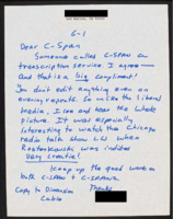 Letter to C-SPAN, 1994?-06-01; 92069 Praises the network as a Transcript service and says it was interesting to watch the Chicago radio talk show when Rostenkowski was indicted. -