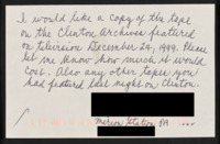 Letter to C-SPAN, 1999-12-24; 19066 Requests a copy of the tape of the Clinton Archives featured on C-SPAN and asks how much it would cost. -