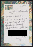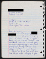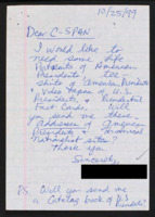 Letter to C-SPAN, 1999-10-10; 92571 Requests that her name be placed on the mailing list and describes her family history research, then suggests doing more series on other people in history and requests that the American Presidents series be close-captioned. -