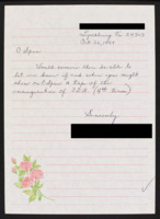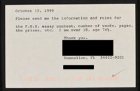 Letter to C-SPAN, 1999-10-23; 33446 Asks if episodes on Franklin D. Roosevelt will be repeated because they lost power during the broadcast. -