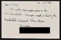 Letter to C-SPAN, 1999-10-19; 62526 Expresses enjoyment of the American Presidents series and asks for tapes of missed episodes. -