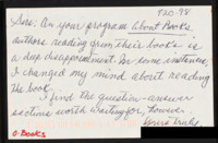 Letter to C-SPAN, 1998-07-20; 10034 Dislikes authors reading sections of their own books but likes question-and-answer portions of the program. -