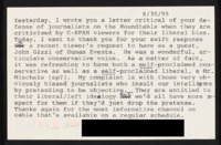 Letter to C-SPAN, 1995-09-05; 68310 Believes journalists and newspapers are generally biased toward liberals and that it results in C-SPAN being biased. -