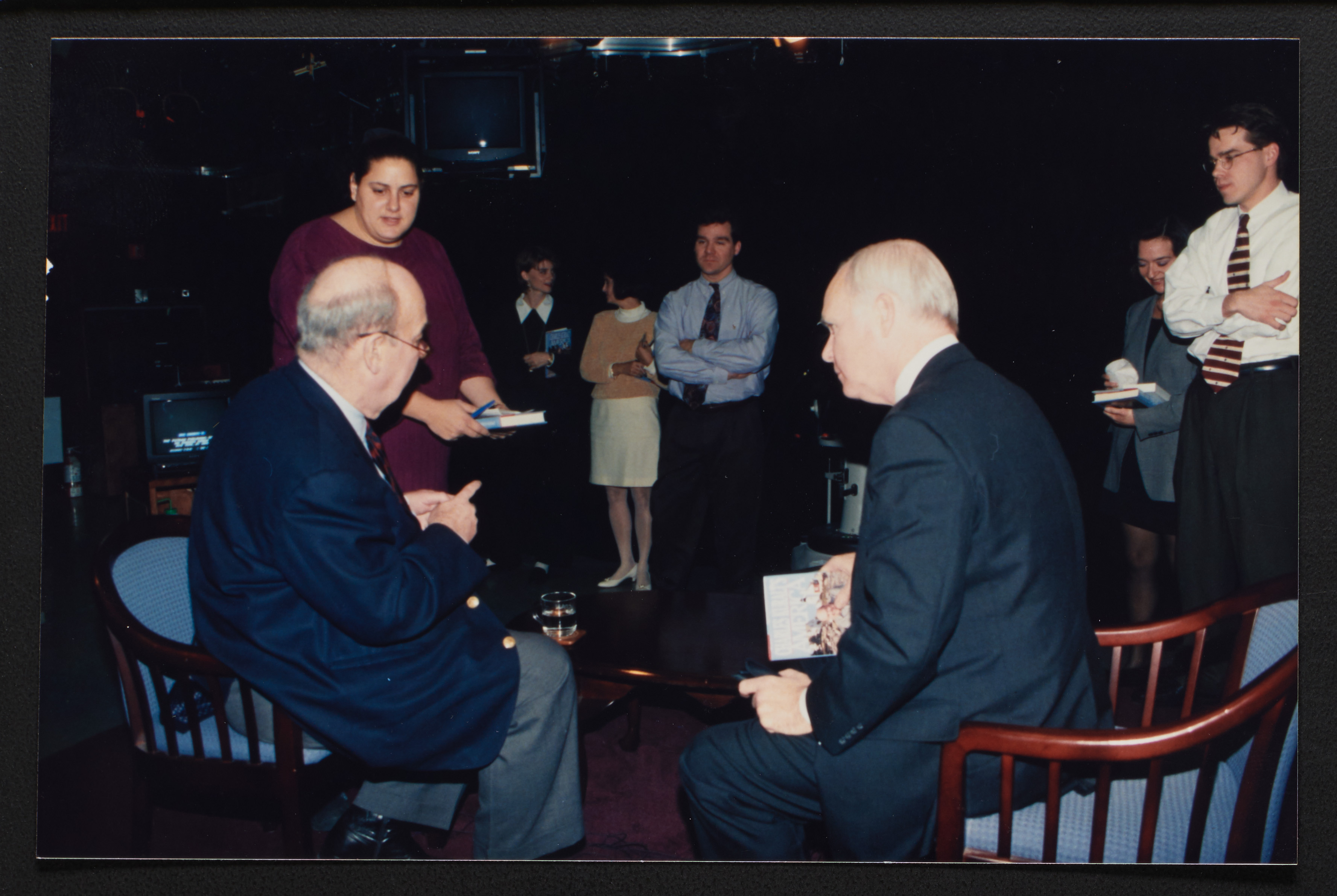 Brian Lamb sits with journalist Charles Kuralt as others chat with them. Kuralt was on Booknotes to discuss his book "Charles Kuralt's America."