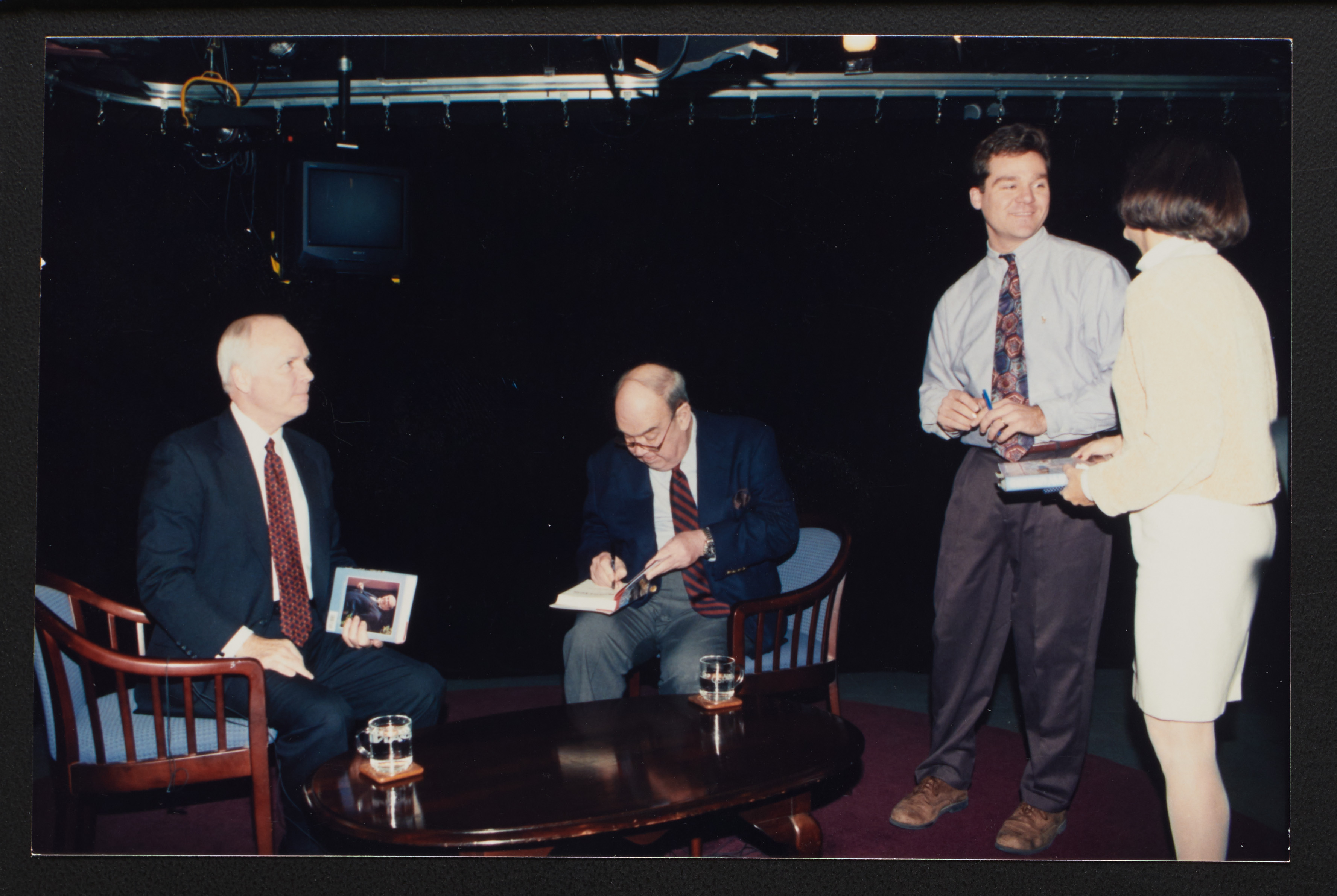 Brian Lamb and others look on as Charles Kuralt signs a copy of his book "Charles Kuralt's America" when he appeared on Booknotes to discuss the book.