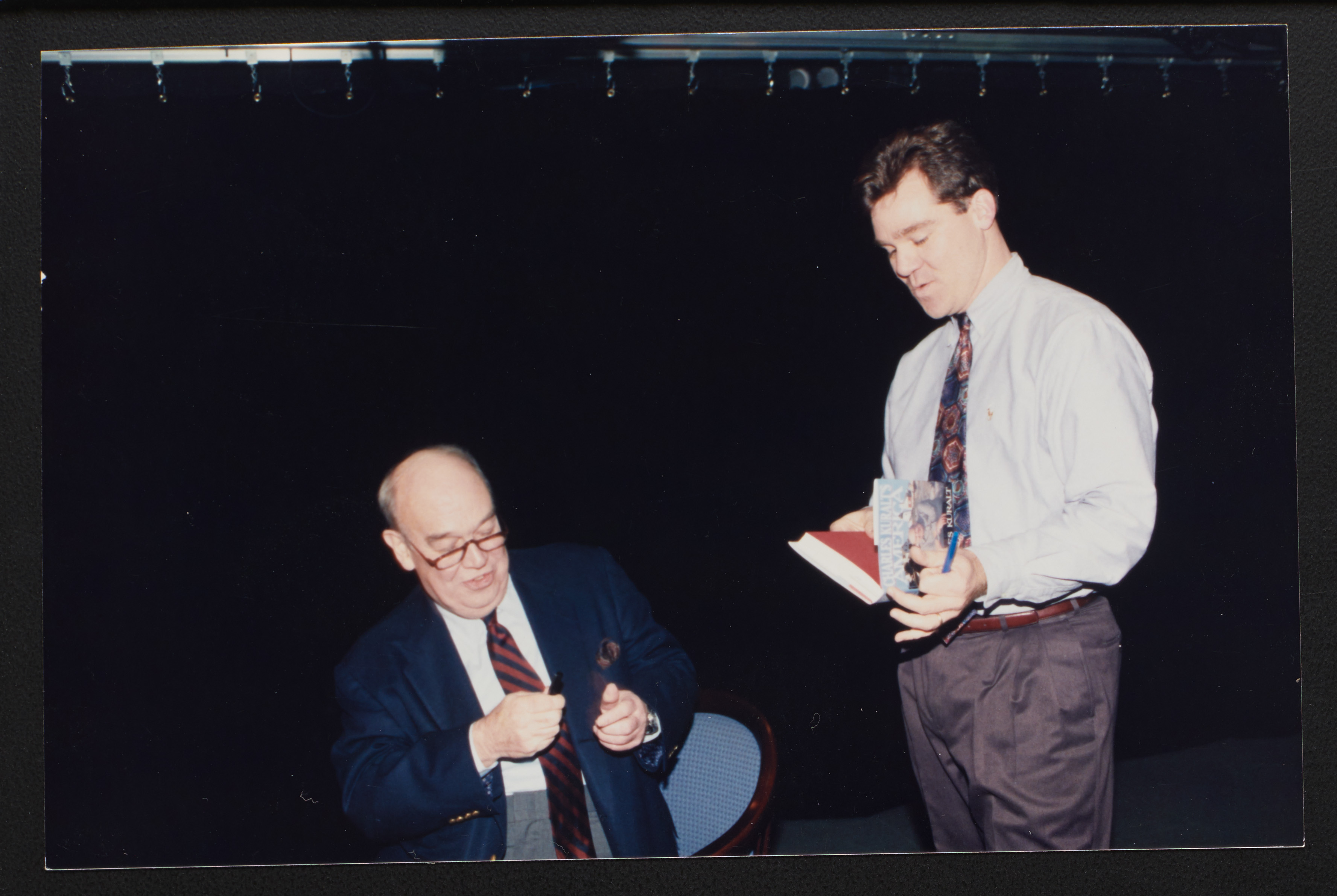 Charles Kuralt caps a pen while a person standing nearby looks at a copy of Kuralt's book "Charles Kuralt's America" when Kuralt appeared on Booknotes.
