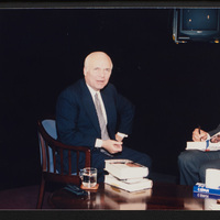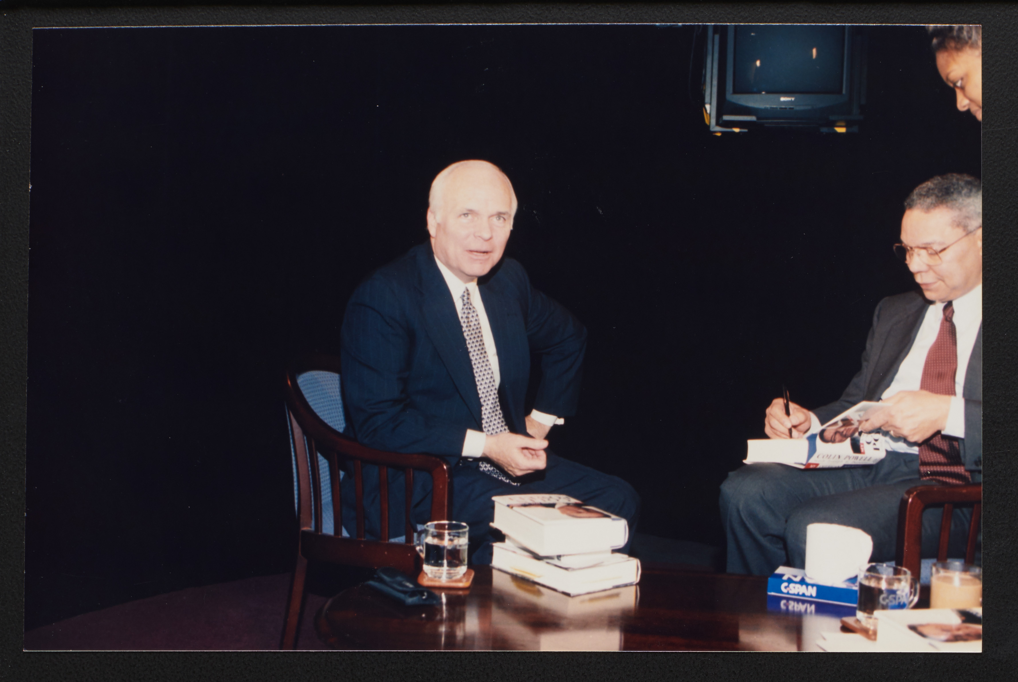 Brian Lamb speaks to someone off camera while he sits with former Secretary of State Colin Powell when Powell appeared on Booknotes to discuss his book "My American Journey."