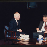 Brian Lamb smiles as he sits with former Secretary of State Colin Powell as Powell signs a copy of his book "My American Journey." Powell appeared on Booknotes to discuss the book.