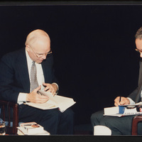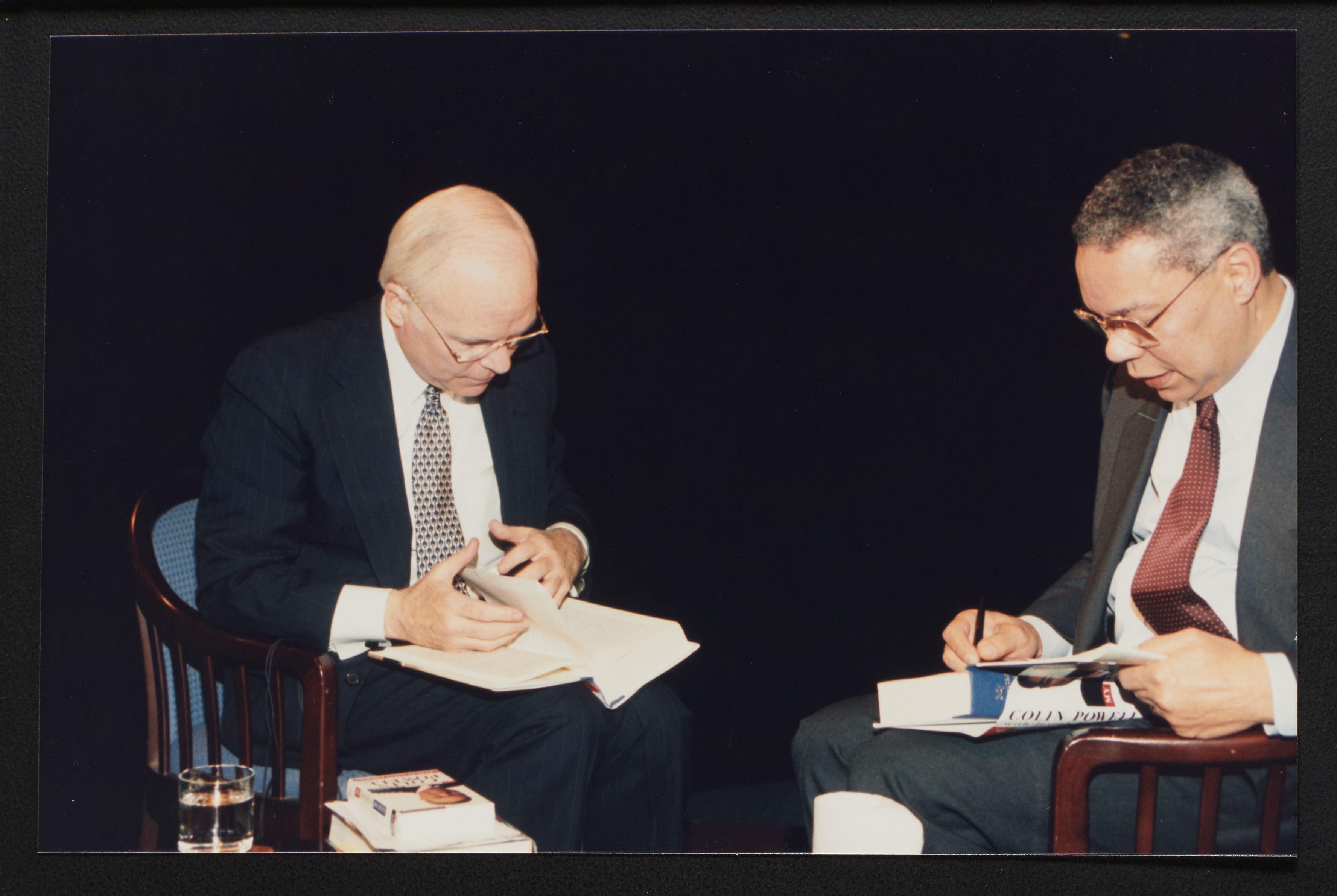Brian Lamb flips through a book as he sits with former Secretary of State Colin Powell as Powell signs a copy of his book "My American Journey." Powell appeared on Booknotes to discuss the book.