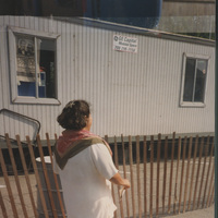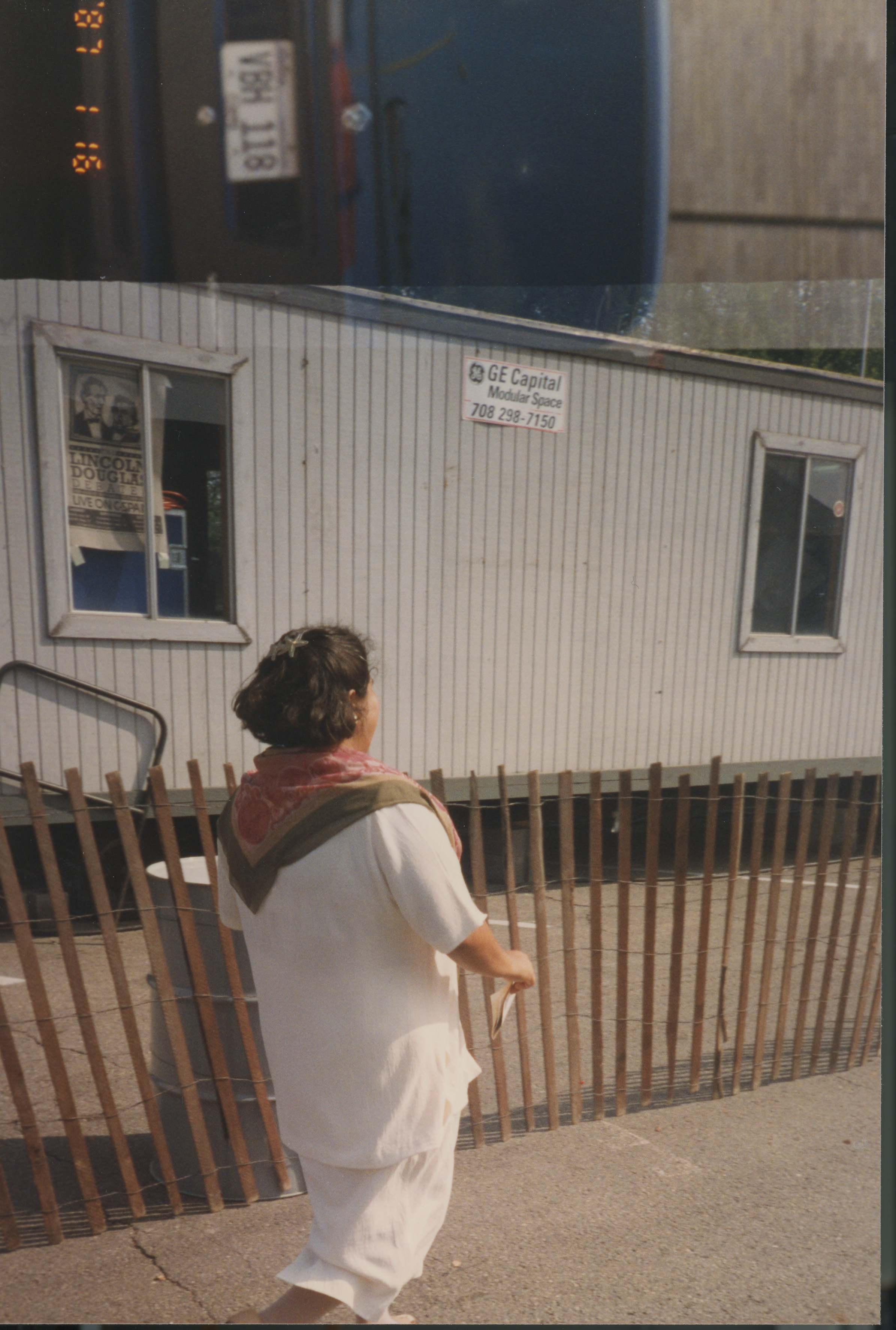A person dressed in white walks past a construction trailer. This photograph was taken as part of filming C-SPAN's Lincoln-Douglas Debates series in Ottawa, Illinois.