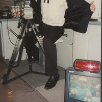 A person in 19th-century period costume opens the front of his suit jacket while sitting next to a video camera on a tripod. This photograph was taken as part of filming C-SPAN's Lincoln-Douglas Debates series in Freeport, Illinois.