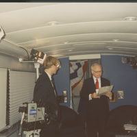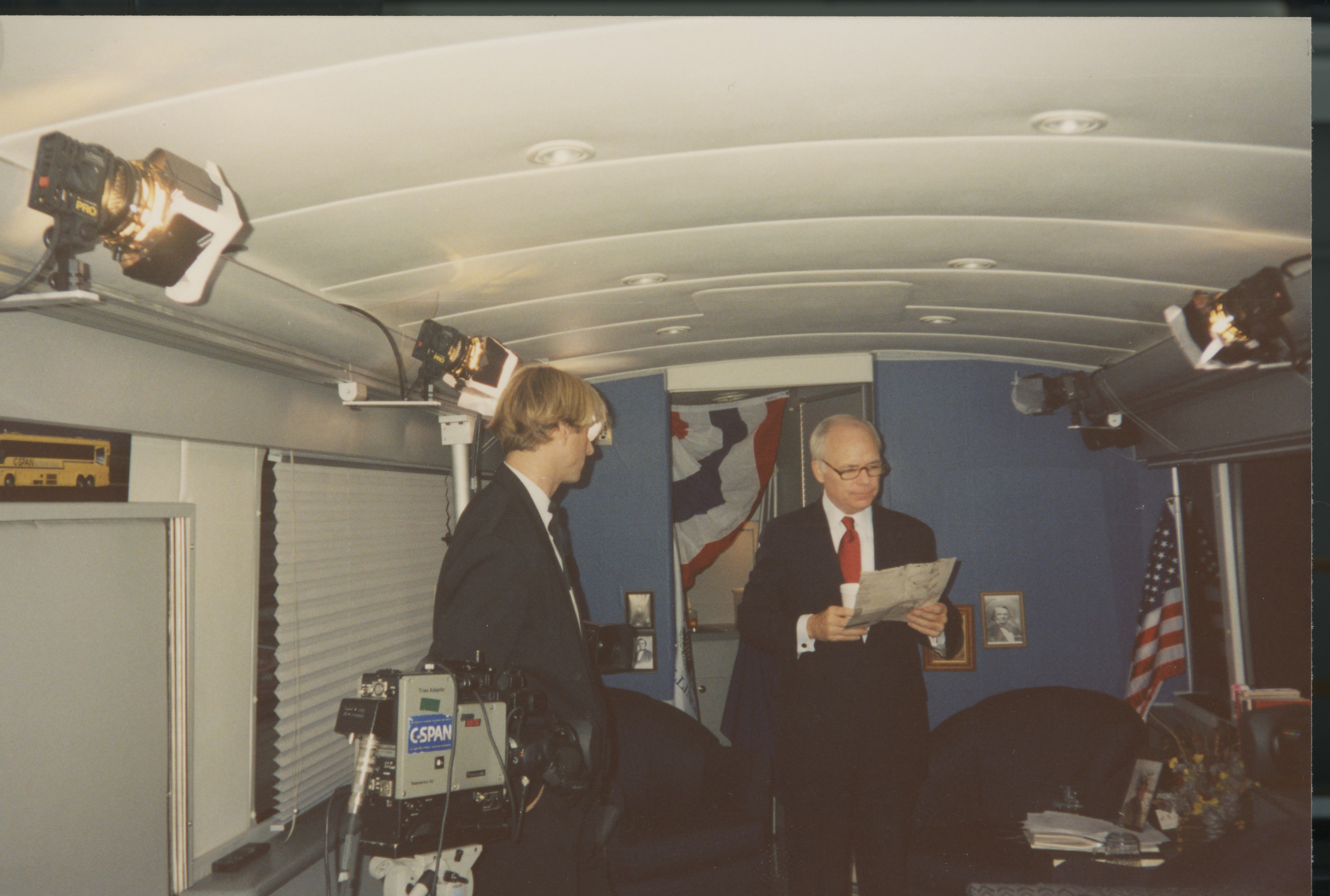 Brian Lamb reads a paper while standing next to a person in a room fitted with a video camera and studio lights. This photograph was taken as part of filming C-SPAN's Lincoln-Douglas Debates series in Freeport, Illinois.