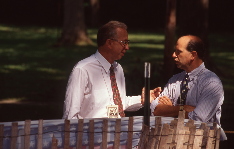 Two people stand outdoors and talk. This photograph was taken as part of filming C-SPAN's Lincoln-Douglas Debates series in Freeport, Illinois.