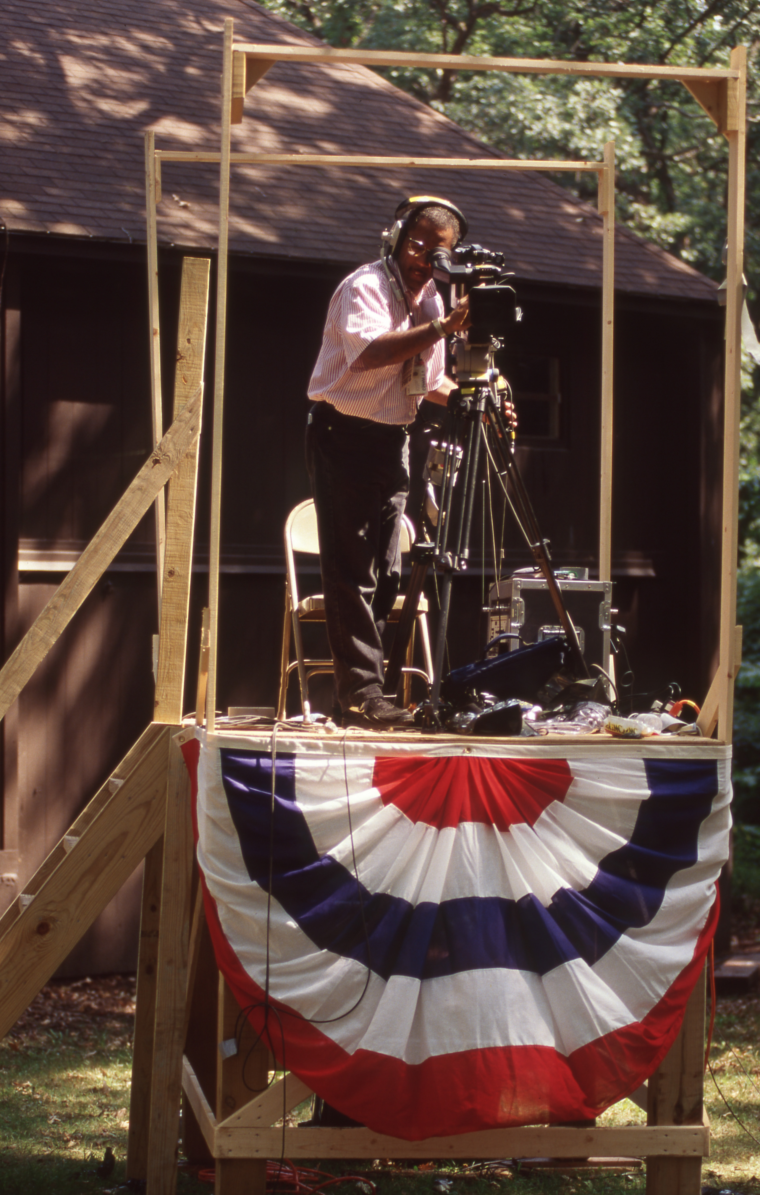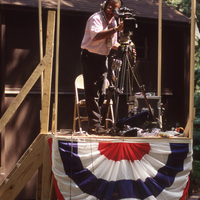 A cameraperson wearing a headset looks through a camera while standing on a wooden platform adorned in a red, white, and blue banner. This photograph was taken as part of filming C-SPAN's Lincoln-Douglas Debates series in Freeport, Illinois.