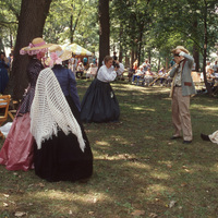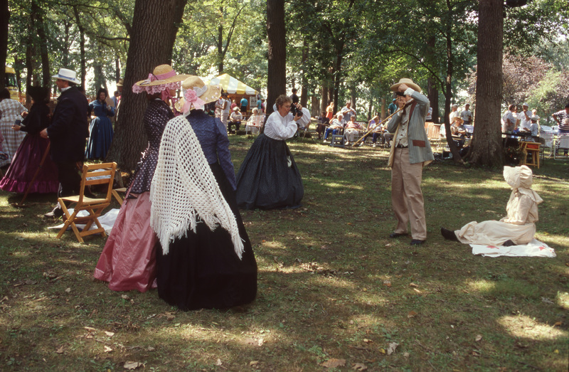 One person dressed in 19th-century period costume photographs two others dressed in 19th-century period dresses, while another person in a 19th-century period dress simultaneously photographs the first photographer. This photograph was taken as part of filming C-SPAN's Lincoln-Douglas Debates series in Freeport, Illinois.