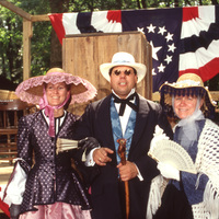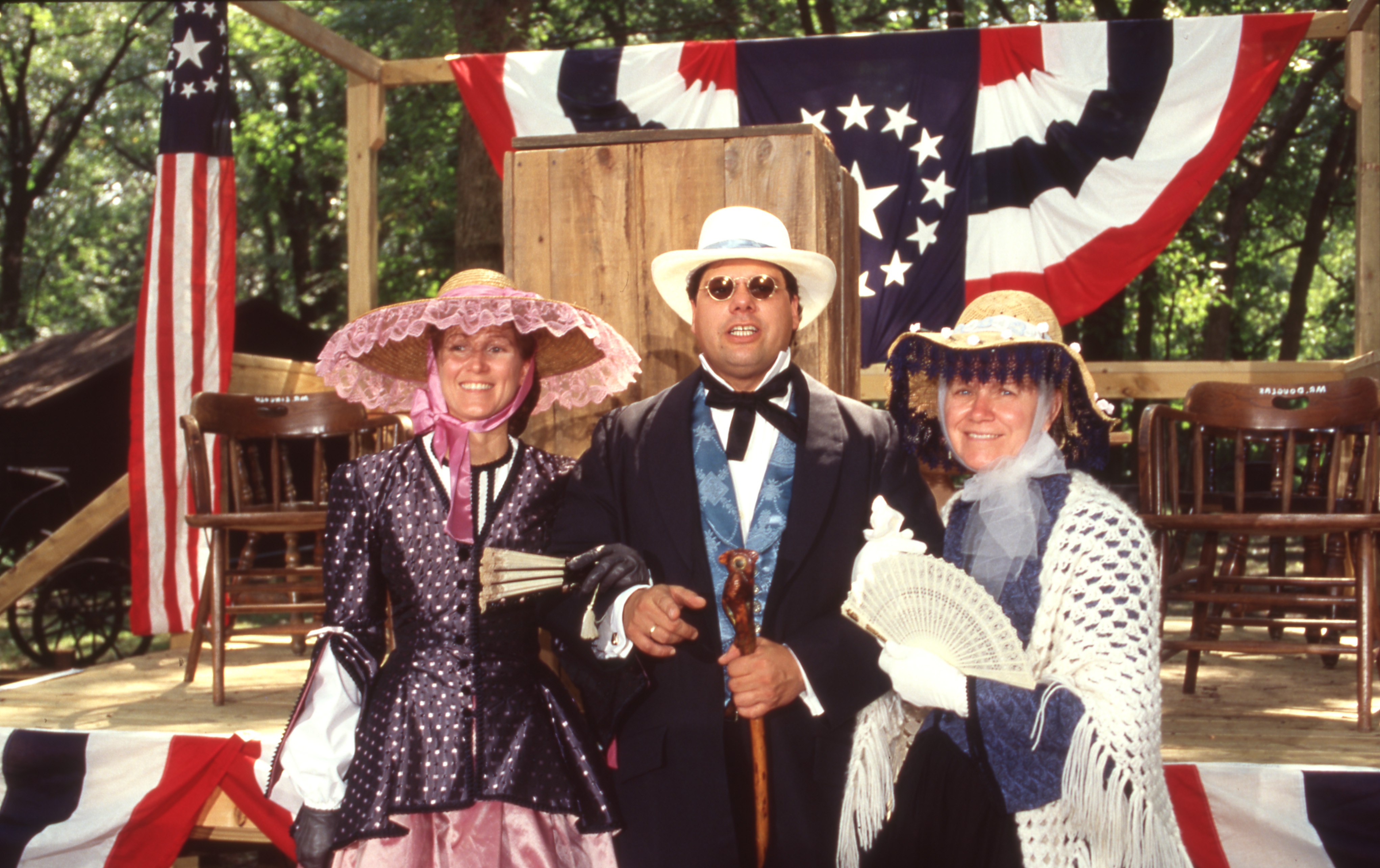 Two people dressed in 19th-century period dresses stand arm in arm with a person in a 19th-century period suit; behind them is the debate platform with a podium and wooden chairs, adorned in red, white, and blue star banners. This photograph was taken as part of filming C-SPAN's Lincoln-Douglas Debates series in Freeport, Illinois.
